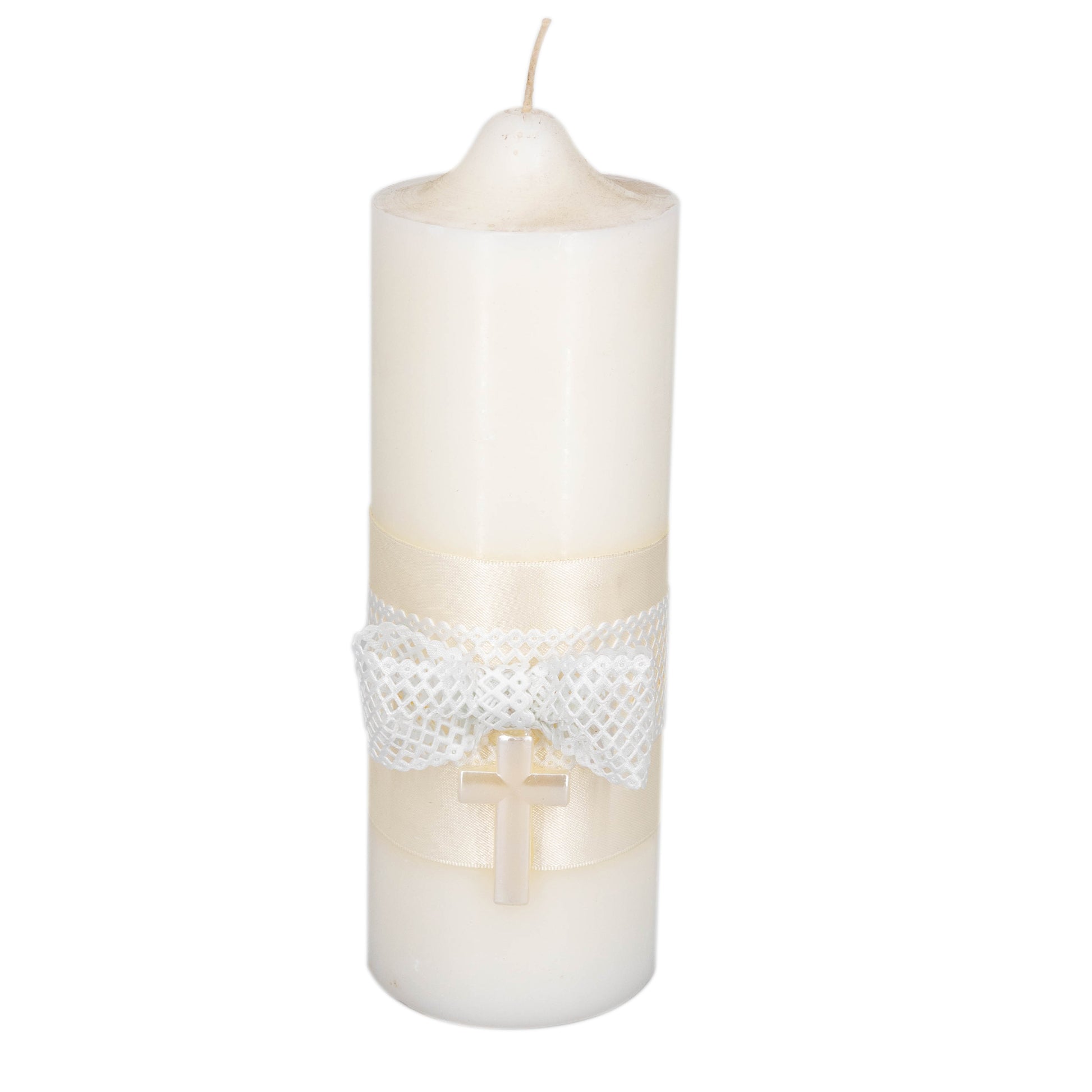 Candle 20X8cm. Wide Ivory Satin base ribbon with quilted style ribbon on top finished with a bow. Pearl finish Cross in centre.