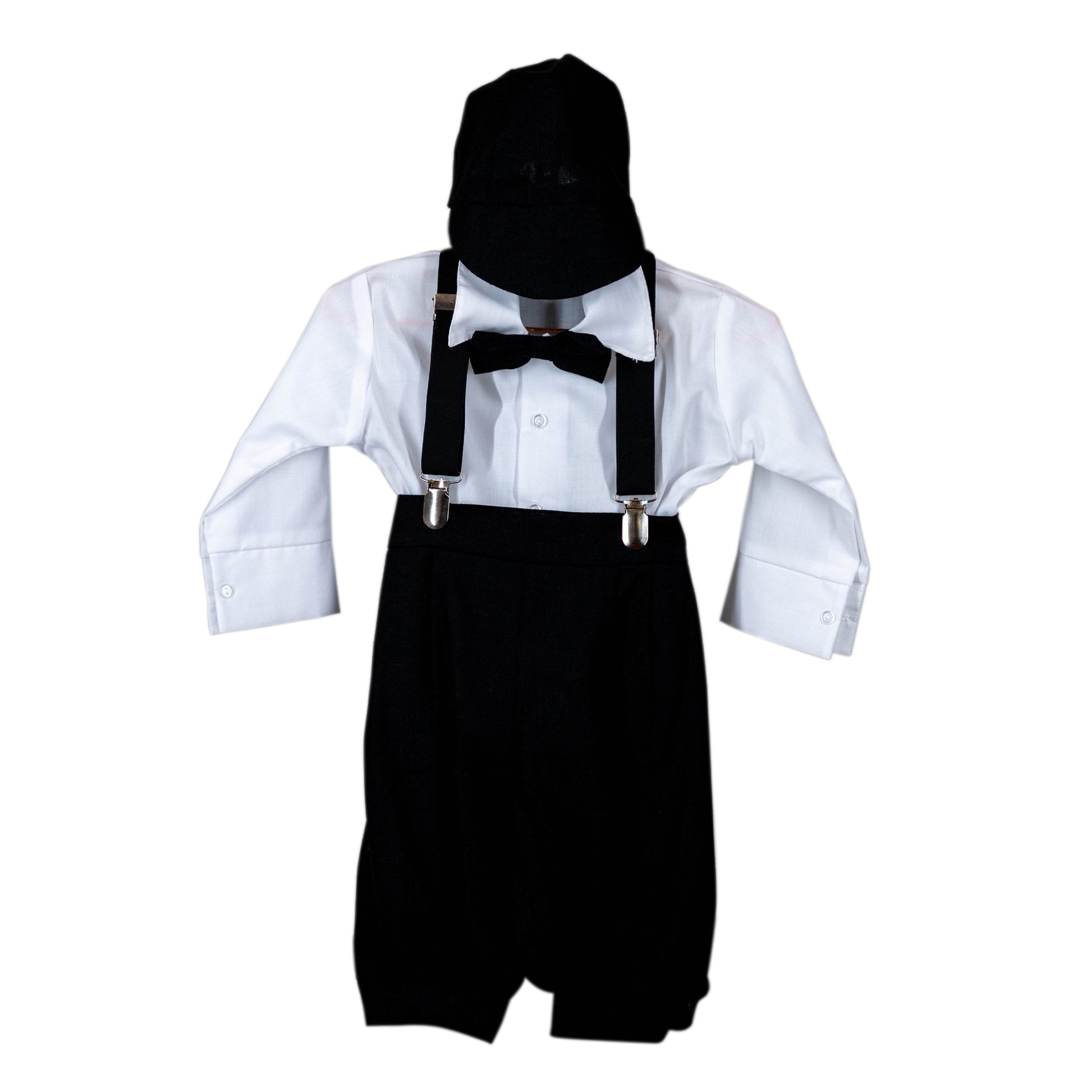 Cotton shirt, black linen Pant, black suspenders with matching bowtie and baseball cap