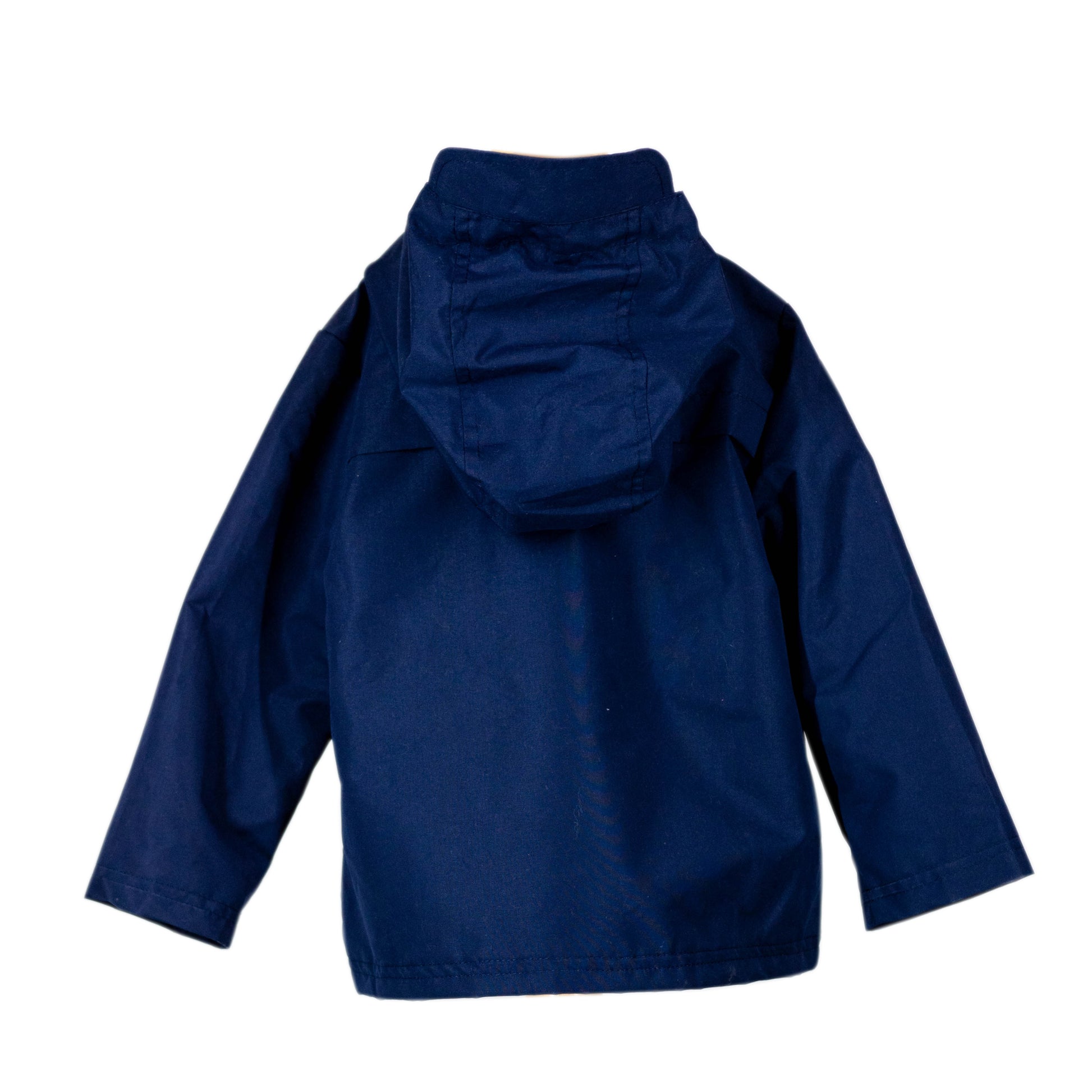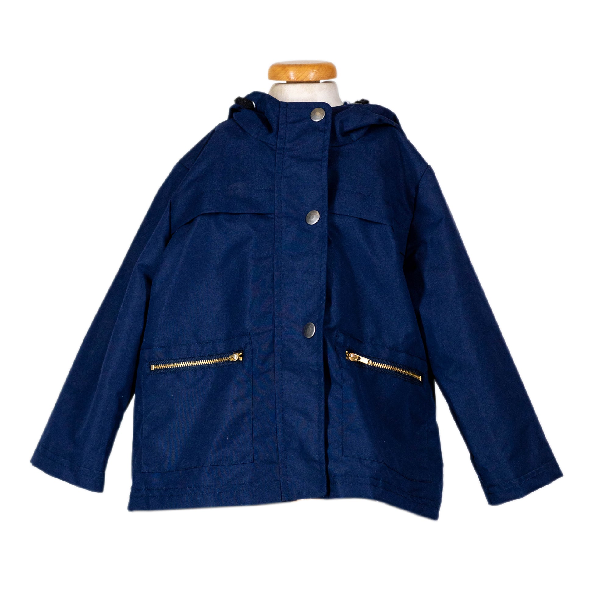Waterproof hooded jacket with navy and white striped inside. Gold zipper dore on and off access and front snap design.
