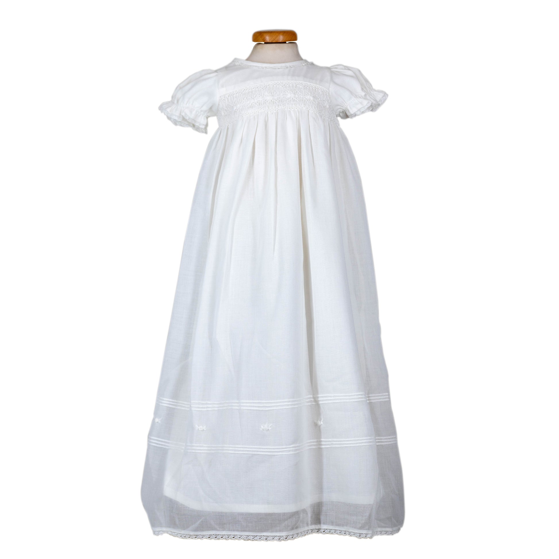 All white short sleeved cotton gown with smocking across the bust area, featuring small rosettes across smocked bust and across the hem of the gown.