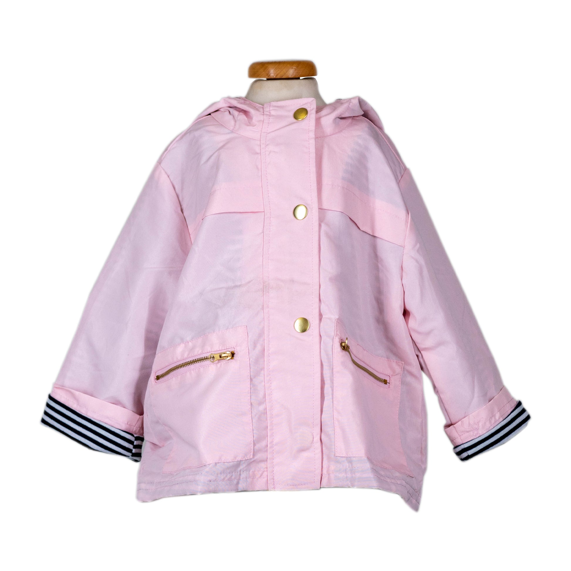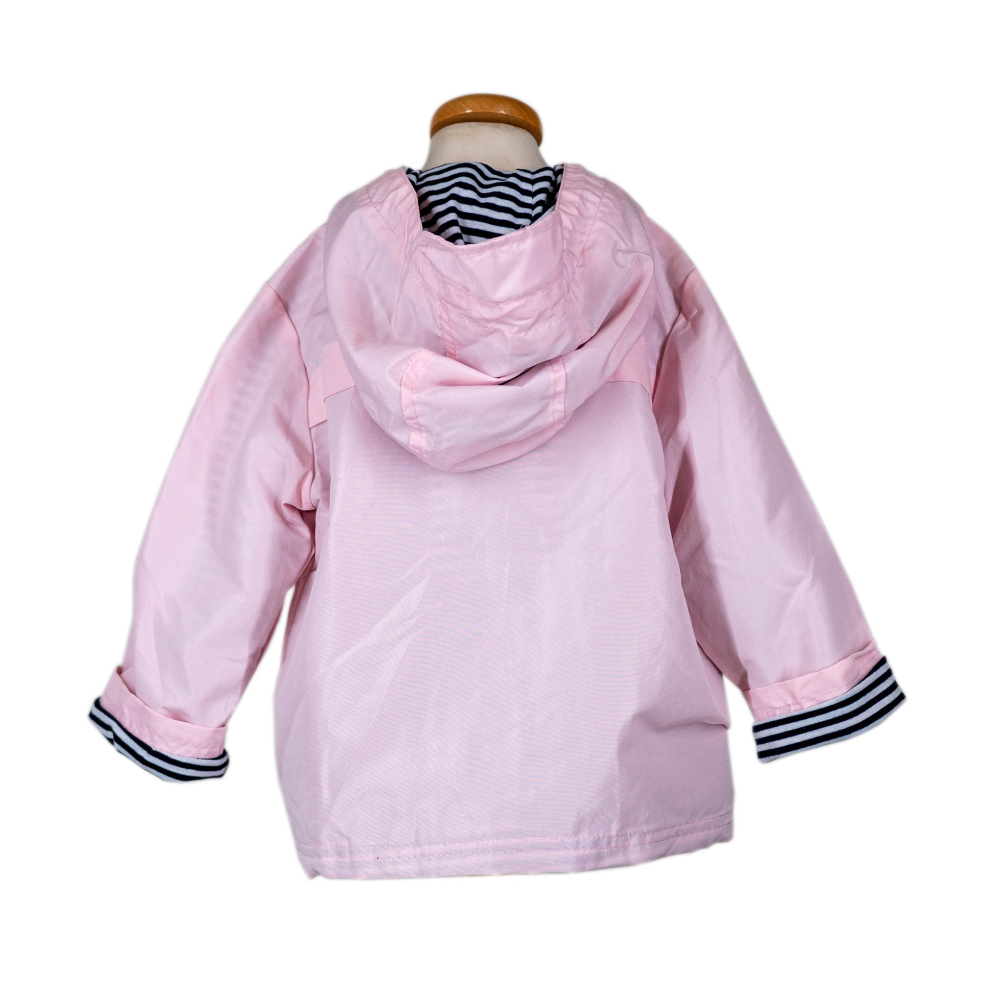 Waterproof Hooded Jacket with Navy and White striped inside. Gold Zipper for easy on and off access and front snap design