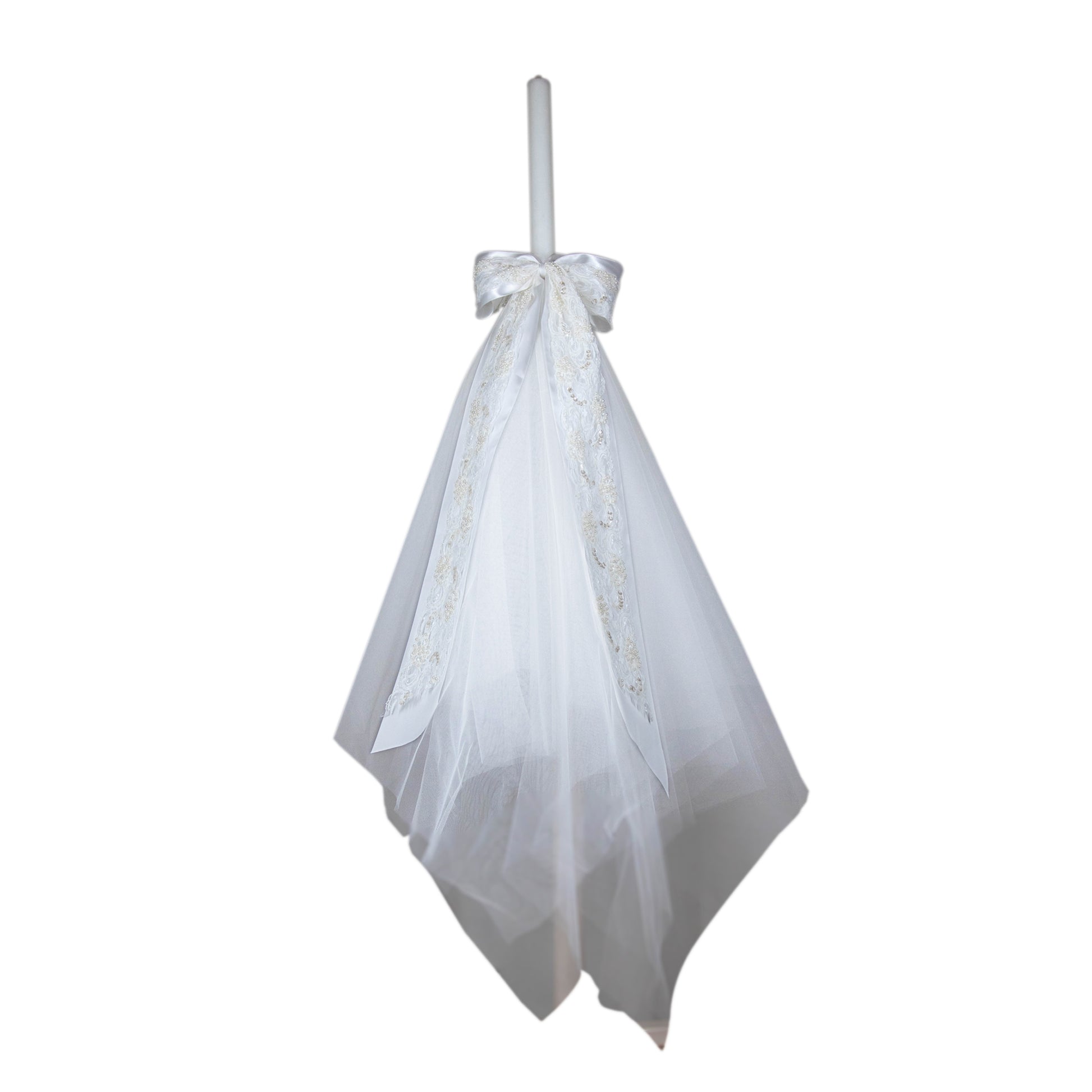Full tulle white skirt with 4inch white satin bow featuring a white lace with pearls and sequences.