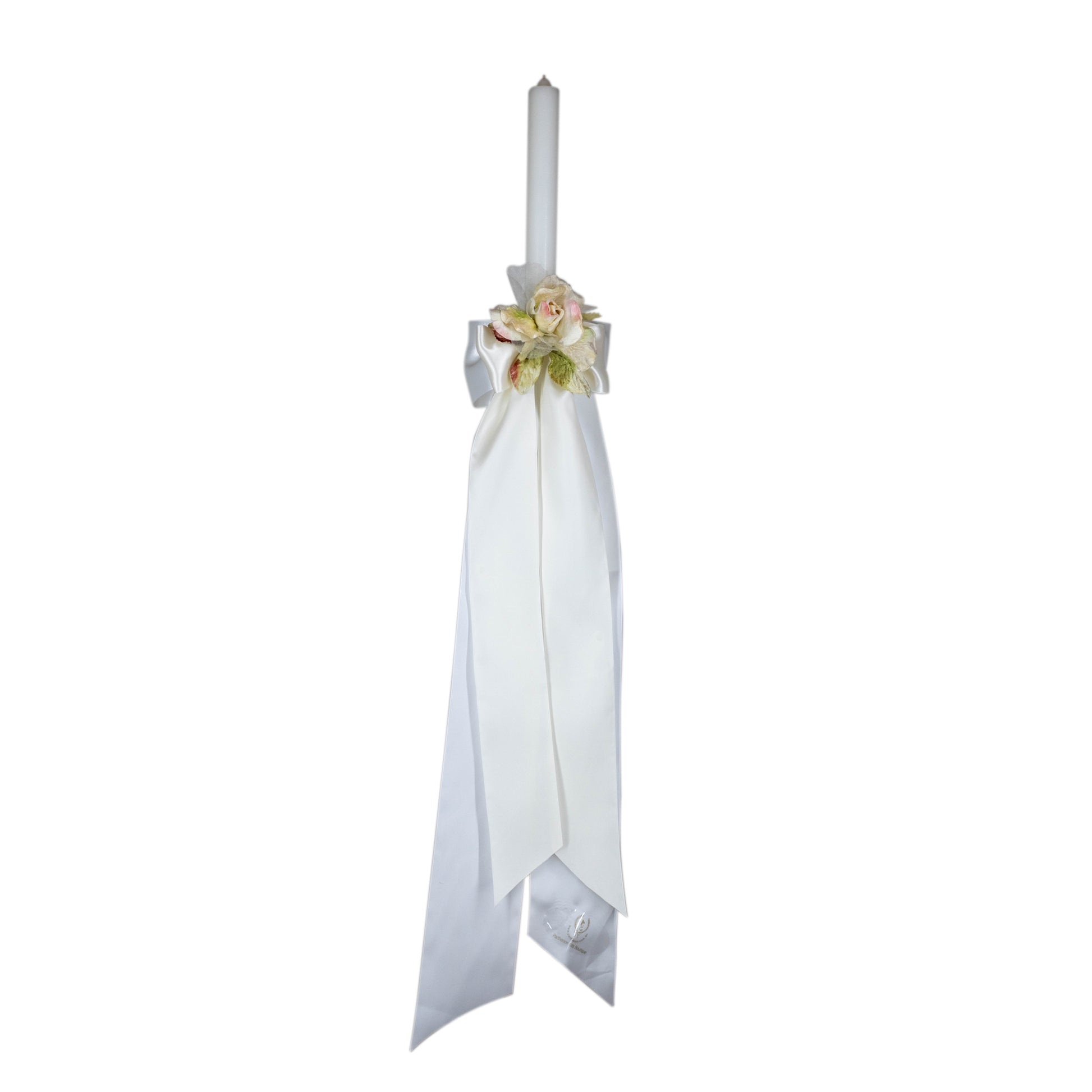 White and Ivory Satin 4inch bows placed in front of a thin layer of tulle. In its centre a large dusty pink and ivory felt floral arrangement.